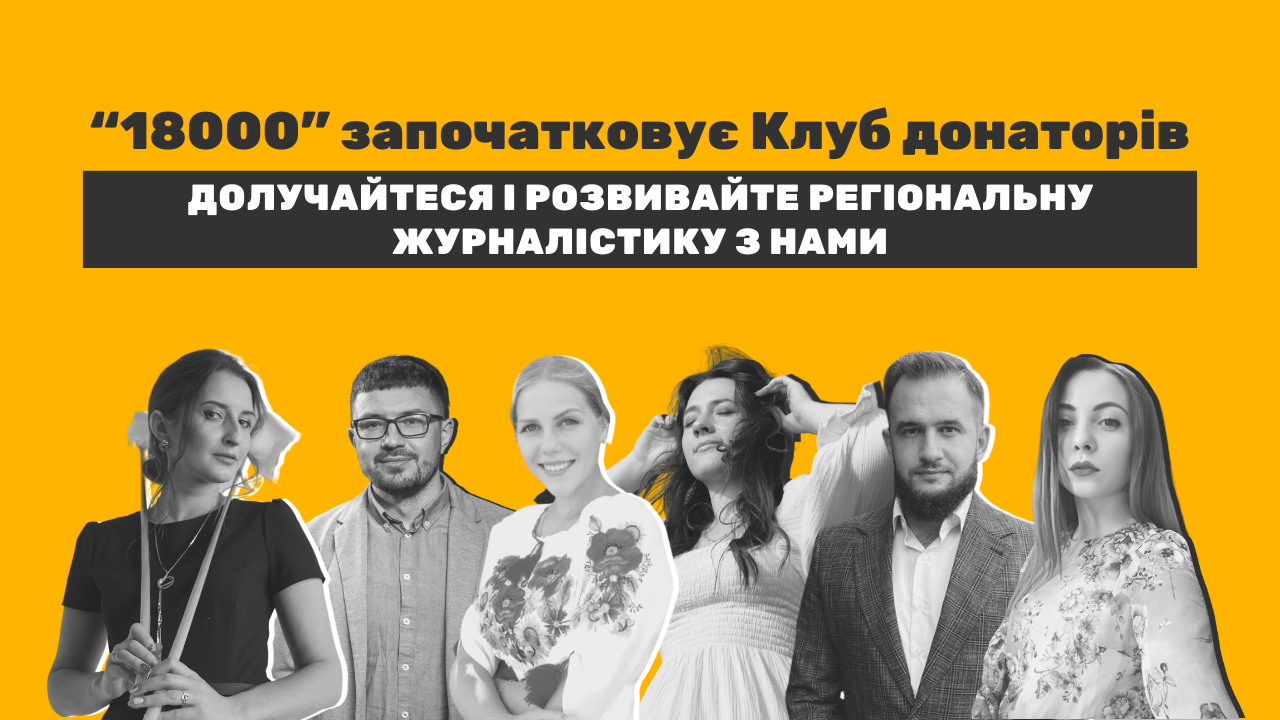 «18000» започатковує Клуб донаторів. Долучайтеся і розвивайте регіональну журналістику з нами Команда "Вісімнадцять три нулі" Сьогодні, 18 січня, видання “18000” святкує свою четверту річницю із дня заснування. У цей день ми анонсуємо щось особливе!