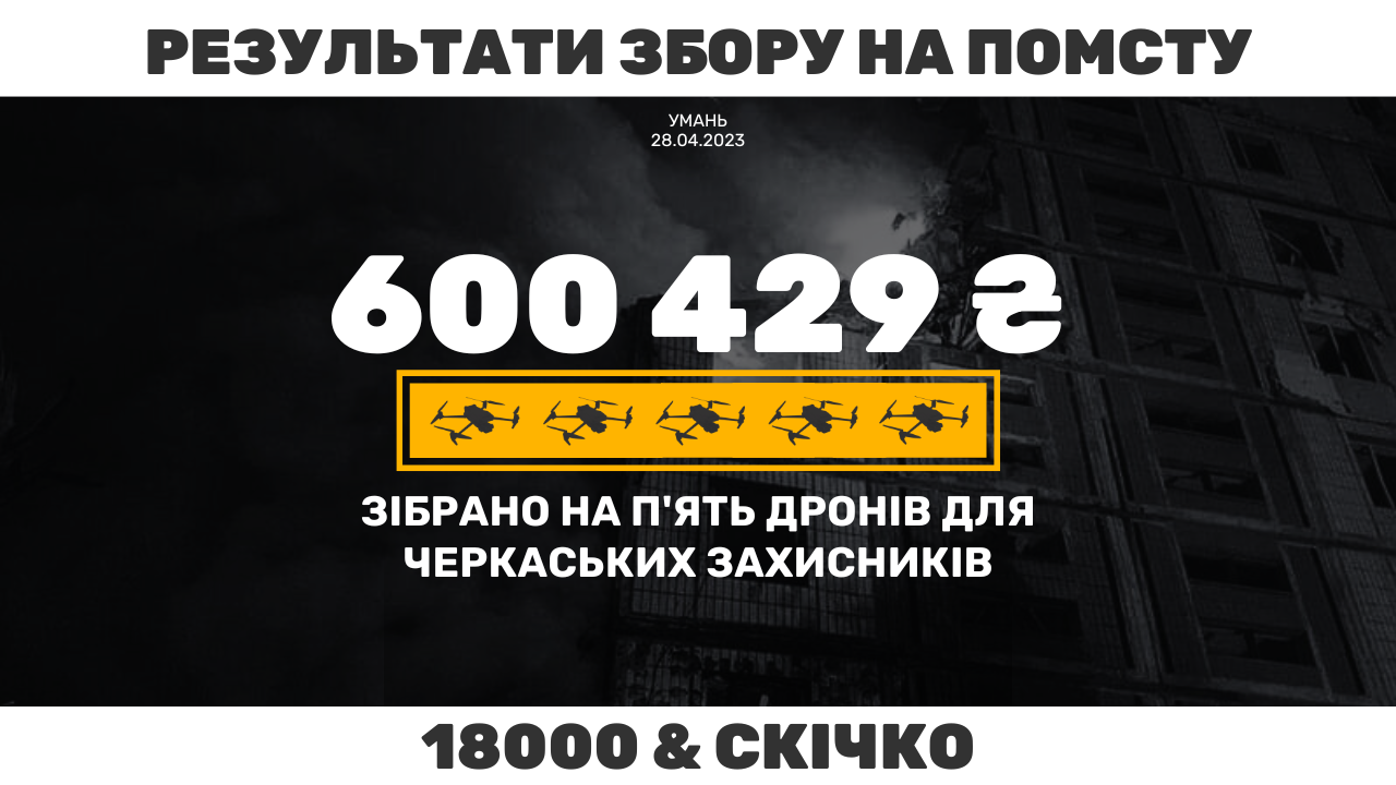 За тиждень читачі «18000» зібрали 1,62 млн грн на 14 дронів для наших воїнів Команда "Вісімнадцять три нулі" Ділимося підсумками збору на дрони для черкащан у ЗСУ.