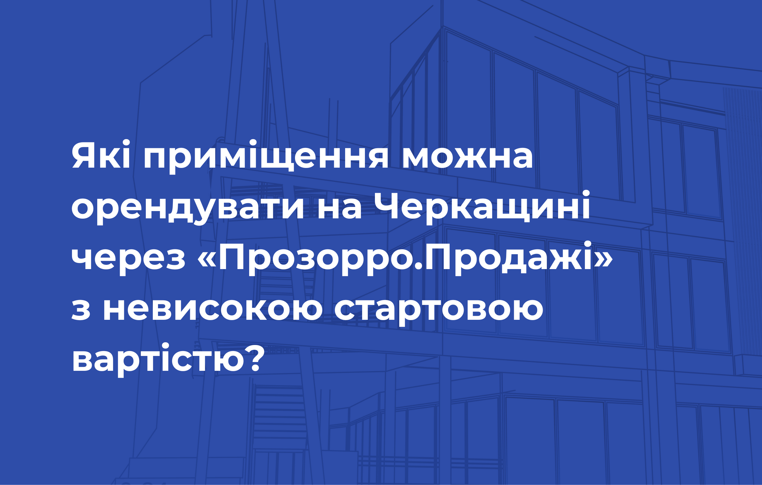 Які приміщення можна орендувати на Черкащині через «Прозорро.Продажі» з невисокою стартовою вартістю? Реклама Знайти приміщення для власної справи можна не тільки в обласному центрі, а й в невеликих містах. Це легко, якщо орендувати комунальну нерухомість —...