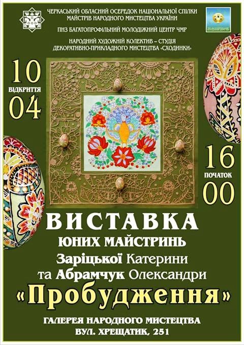 Відкриття творчої виставки «Пробудження» талановитих вихованок Багатопрофільного молодіжного центру Олександри Абрамчук та Катерини Заріцької відбудеться 10 квітня о 16.00 годині у Галереї народного мистецтва.