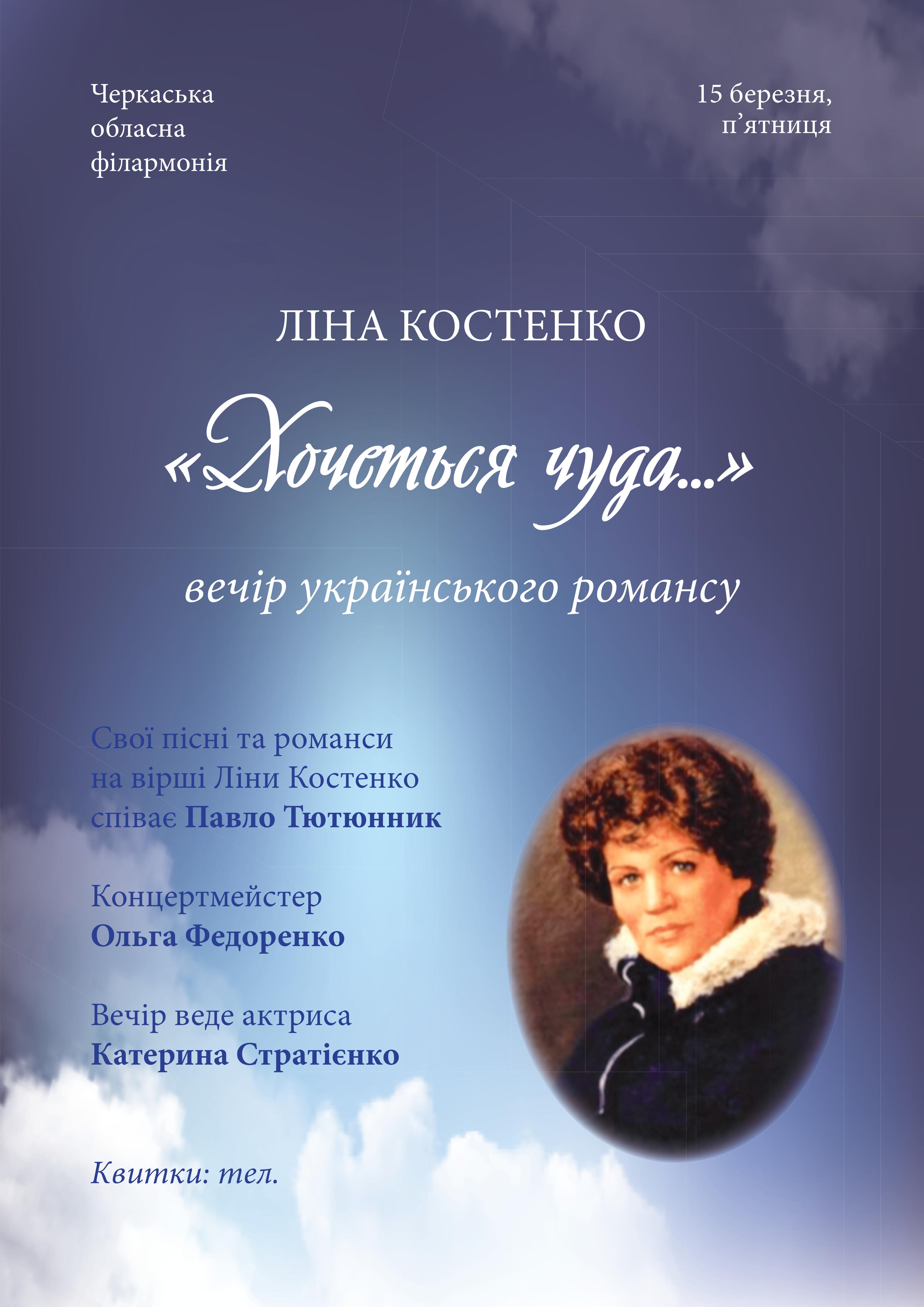 Організатори – Павло Тютюнник і народна артистка України Раїса Недашківська – пропонують своїм слухачам витончену лірику легенди української поезії Ліни Костенко.