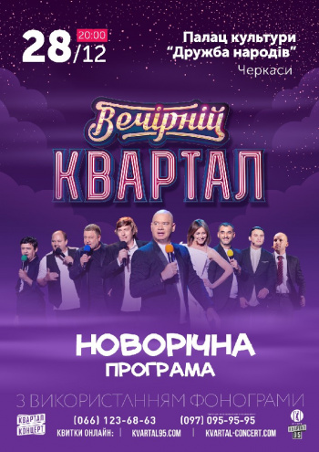 Квитки можна придбати тут: https://cherkasy.karabas.com/vechirnij-kvartal-novorichna-programa-7.