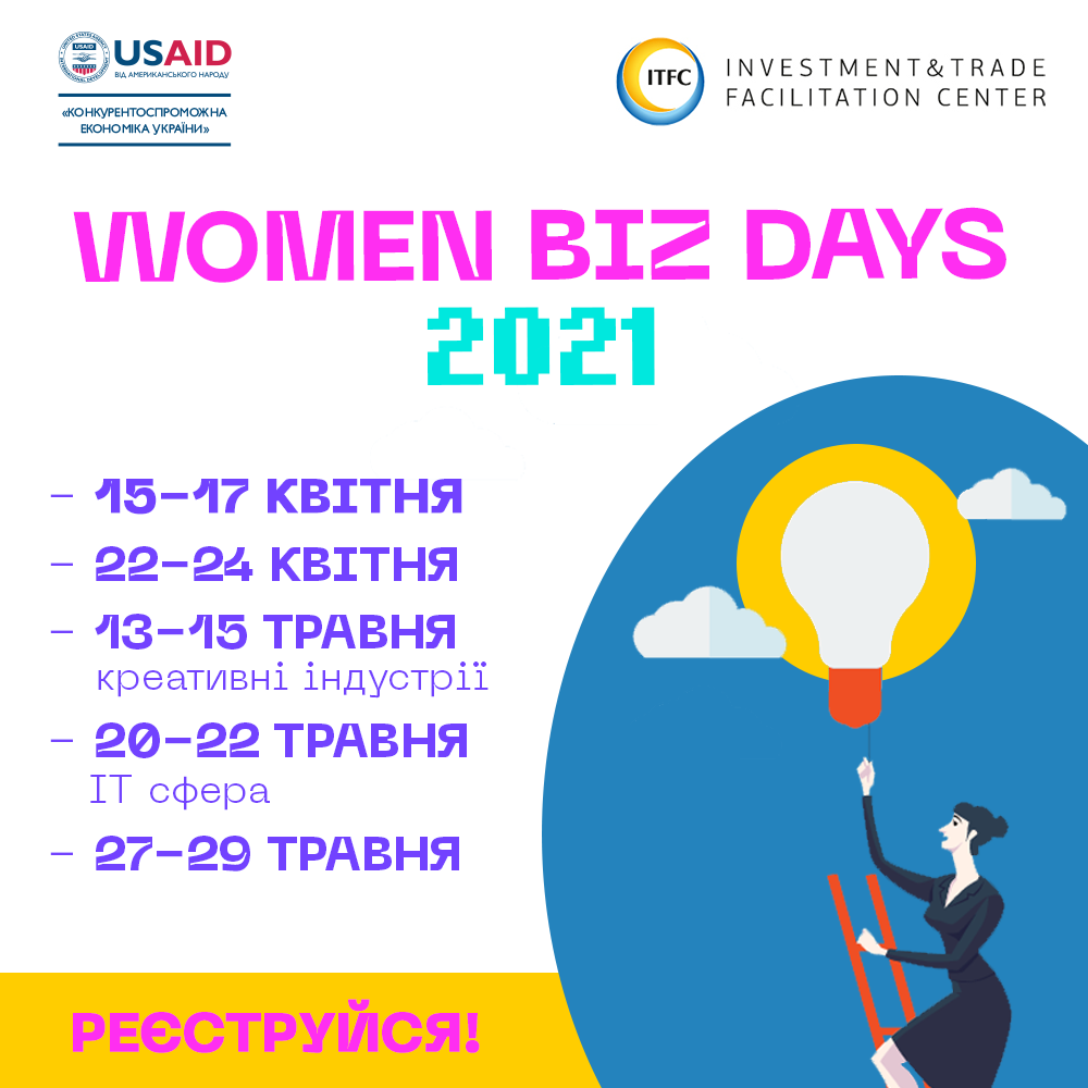 Впродовж квітня та травня відбудеться серія безкоштовних онлайн бізнес‐семінарів Women Biz Days для жінок‐підприємниць, організованих Українським центром сприяння інвестиціям та торгівлі (ITFC) за підтримки Програми USAID «Конкурентоспроможна економіка України».