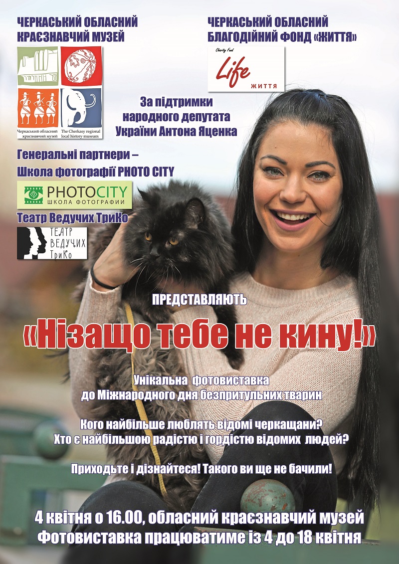 4 квітня о 16:00 у Черкаському обласному краєзнавчому музеї відбудеться відкриття фотовиставки улюбленців відомих черкащан «Нізащо тебе не кину!». Виставка приурочена до Дня безприткльних тварин.