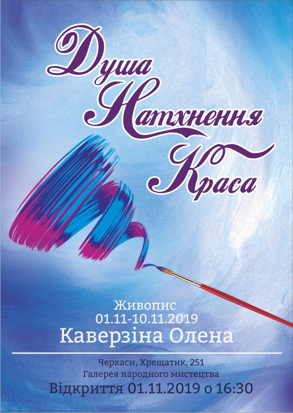 1 листопада 2019 року в Черкаській галереї народного мистецтва відбудеться виставка‐презентація картин місцевої художниці Олени Каверзіної під назвою «ДНК – Душа. Натхнення. Краса».