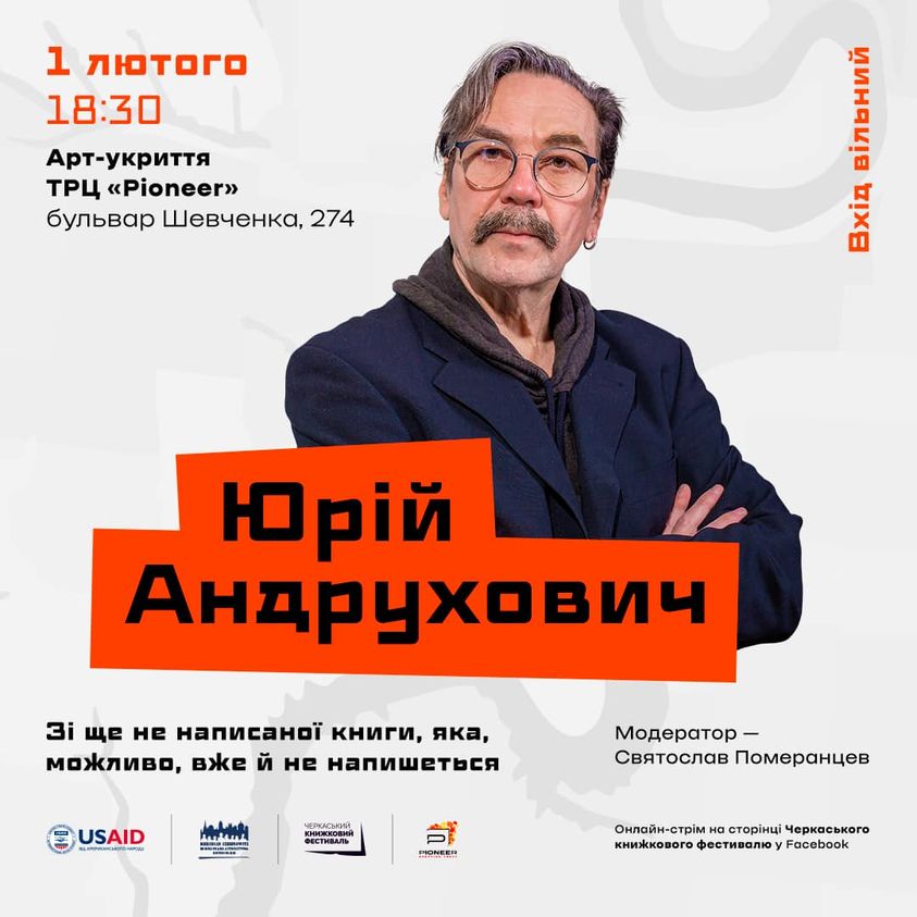 Літературний вечір українського поета, прозаїка та перекладача Юрія Андруховича відбудеться 1 лютого о 18:30 в арт‐укритті ТРЦ «PIONEER». Модератор заходу – Президент Міжнародної літературної корпорації MERIDIAN CZERNOWITZ та видавець Святослав Померанцев. Він поспілкується із Юрієм Андруховичем про творчість письменника під час війни, про культурну дипломатію України, активним учасником якої є автор, про майбутнє української літератури.