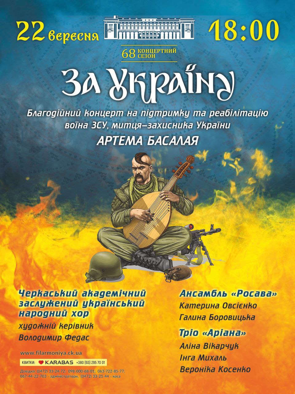 Черкаської обласної філармонія запрошує відвідати благодійний концерт «ЗА УКРАЇНУ» на підтримку та реабілітацію воїна ЗСУ, митця та батька 6‐ох дітей Артема Басалая.