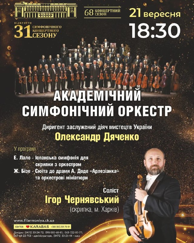 Відкриття 31‐го симфонічного сезону Черкаська обласна філармонія ознаменовує концертом Академічного симфонічного оркестру під орудою заслуженого діяча мистецтв України Олександра Дяченка.
