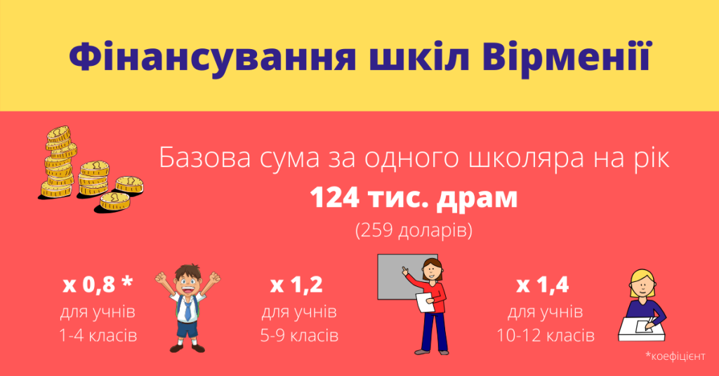 — У 2005 році ми перейшли на фінансування за кожного учня. Базова сума, яку отримує сьогодні школа на рік за одного учня, становить 124 тис. драм (260 доларів).