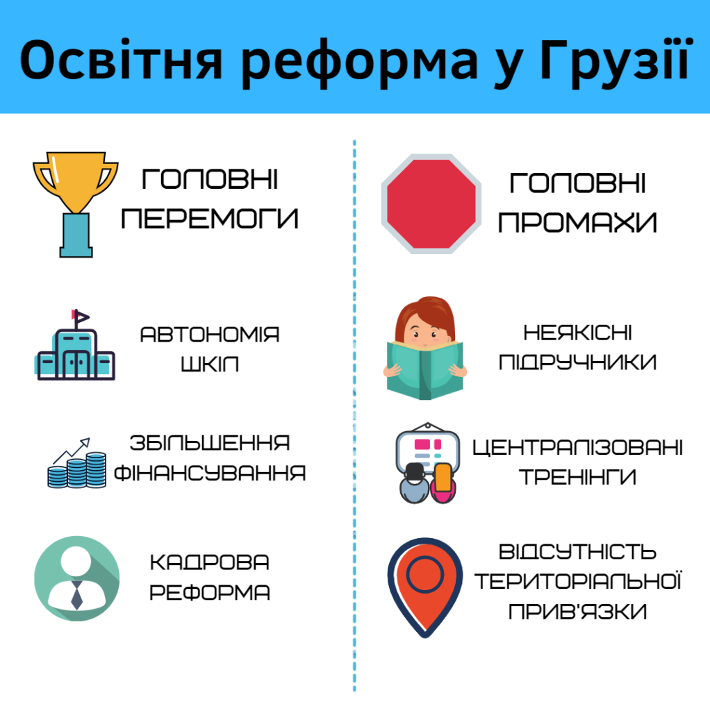 Грузія – однією з перших розпочала процес реформування освітньої галузі у далекому 2003 році. За цей час тут устигли отримати як перші перемоги, як‐то зміна підходів у викладанні, так і відчути на собі перші болючі поразки, пов’язані з неякісними підручниками і неефективними тренінгами.
