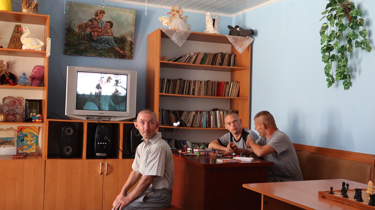 У кімнаті для відпочинку увага підопічних прикута до телевізора. На ньому показують виступи самих мешканців, які відзняли під час концертів.