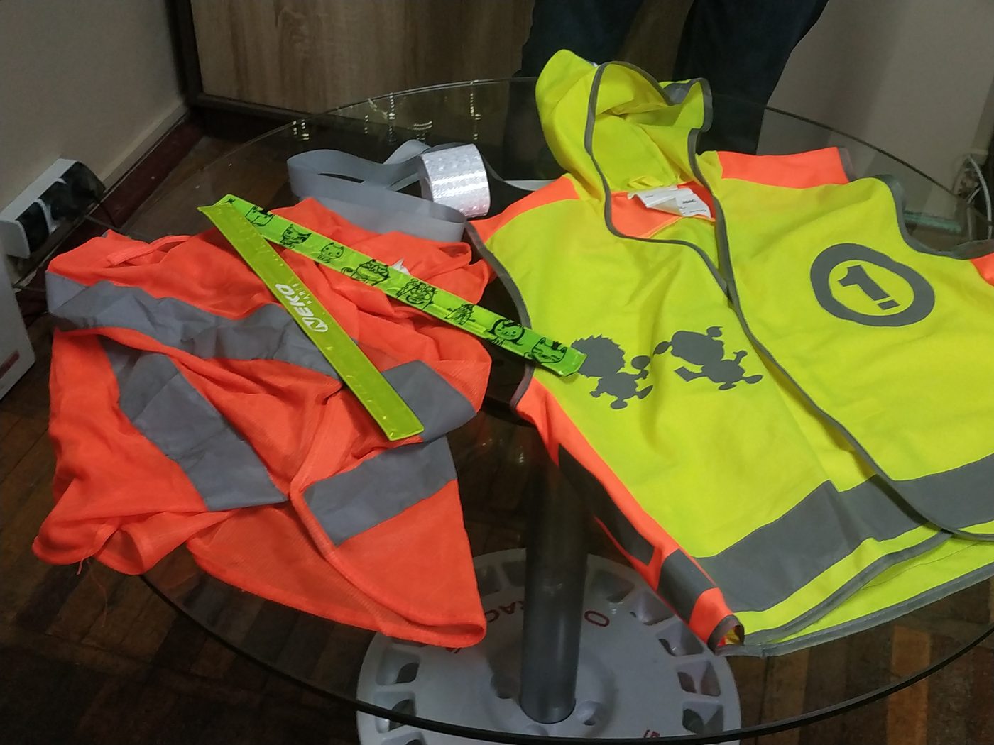 Поряд ще стрічка‐самоклейка, яка коштує трішки дорожче, придбані магнітні стрічки у веломагазині, німецький жилет для школярів та звичайний, на кшталт тих, які використовують комунальні служби.