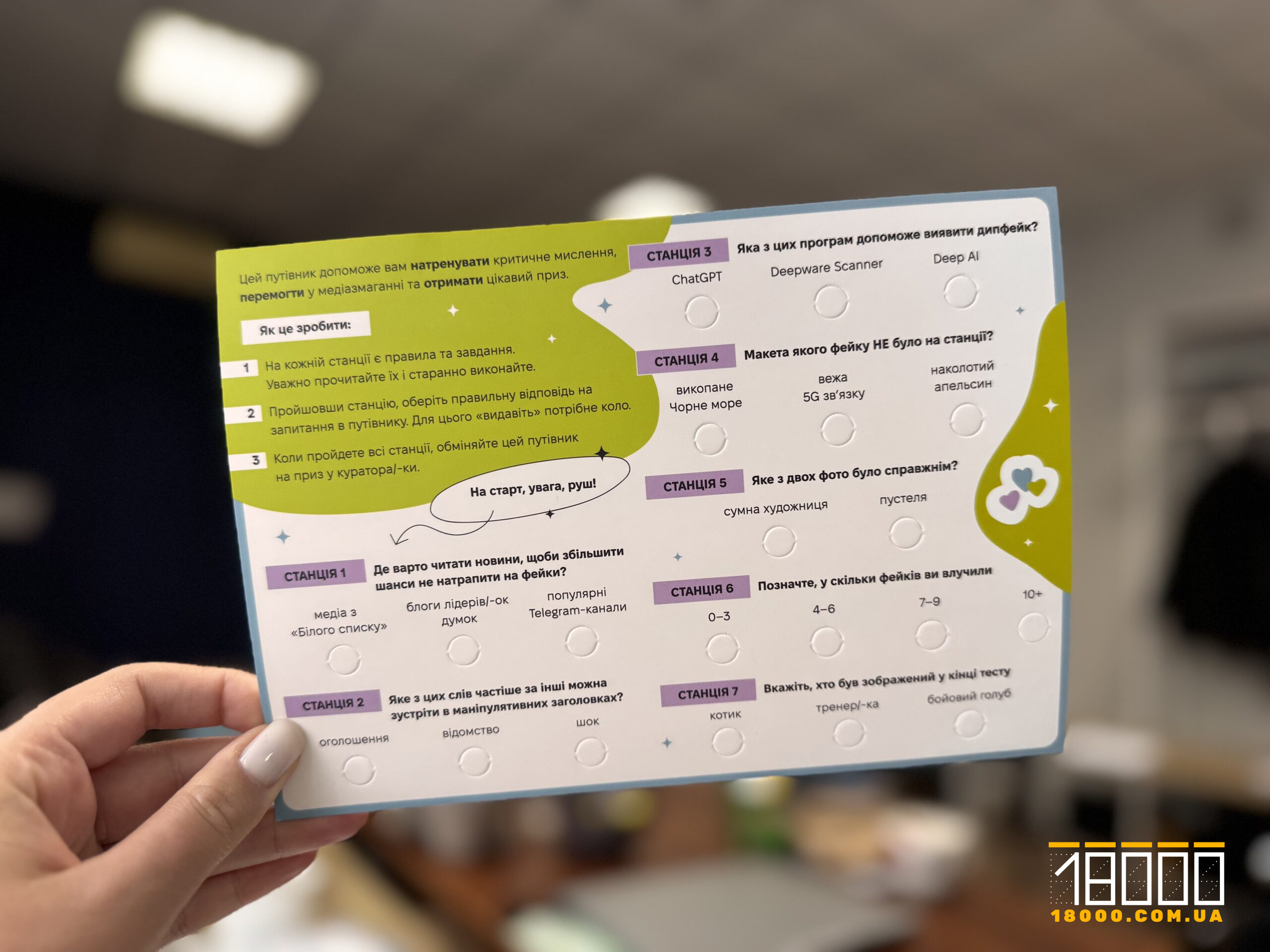На виставці представили сім локацій, кожна з яких має свою тему – штучний інтелект, маніпулятивні заголовки, дипфейки тощо. Кожен учасник отримує путівник, який допомагає зорієнтуватися.