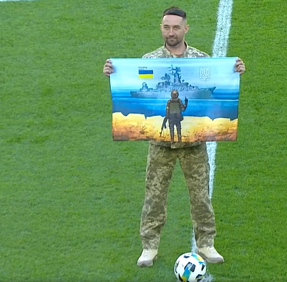 Як йдеться в дописі, перший удар по м’ячу виконав Роман Грибов, який є автором фрази «русскій воєнний корабль». Цей вислів був найбільш цитованим у перші місяці повномасштабного вторгнення.