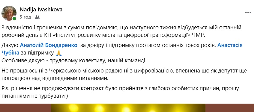Як писав 18000, Надія Івашкова депутатка від фракції «Голос» у Черкаській міській раді. Її призначили директором КП «Інститут розвитку міста» в серпні 2022 року.