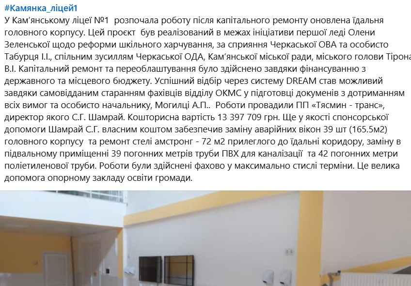 Відповідно до повідомлення в мережі «Фейсбук», 11 лютого цього року в Кам’янському ліцеї №1 запрацював оновлений харчоблок, ремонт якого виконувало місцеве підприємство «Тясмин‐транс». Фінансування здійснювалось переважно коштом державного бюджету у межах програми з реформування шкільного харчування Олени Зеленської. Відповідно до оголошення, кошторис робіт складає 12,9 млн гривень.