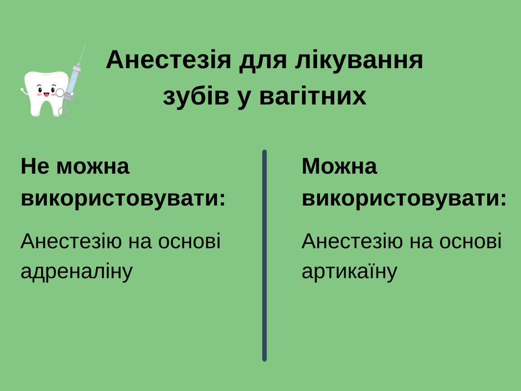 Використання анестезії під час лікування чи видалення зубів вагітній дозволене. Однак це має бути спеціальна анестезія. Її особливість в тому, що вона не має містити адреналіну.