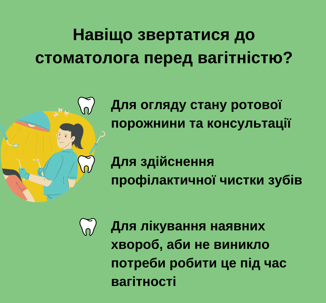 До стоматолога бажано звернутися за три місяці до планування вагітності. Лікар має провести огляд, надати консультацію й зробити професійну гігієну. Зокрема, при огляді він ознайомиться зі станом кожного зуба. За потреби зробить КТ‐знімок. Він дасть можливість подивитися не тільки на те, що відбувається із зубами в порожнині рота, а й що відбувається з ними в кістці: чи немає запалення або ж вторинного процесу.