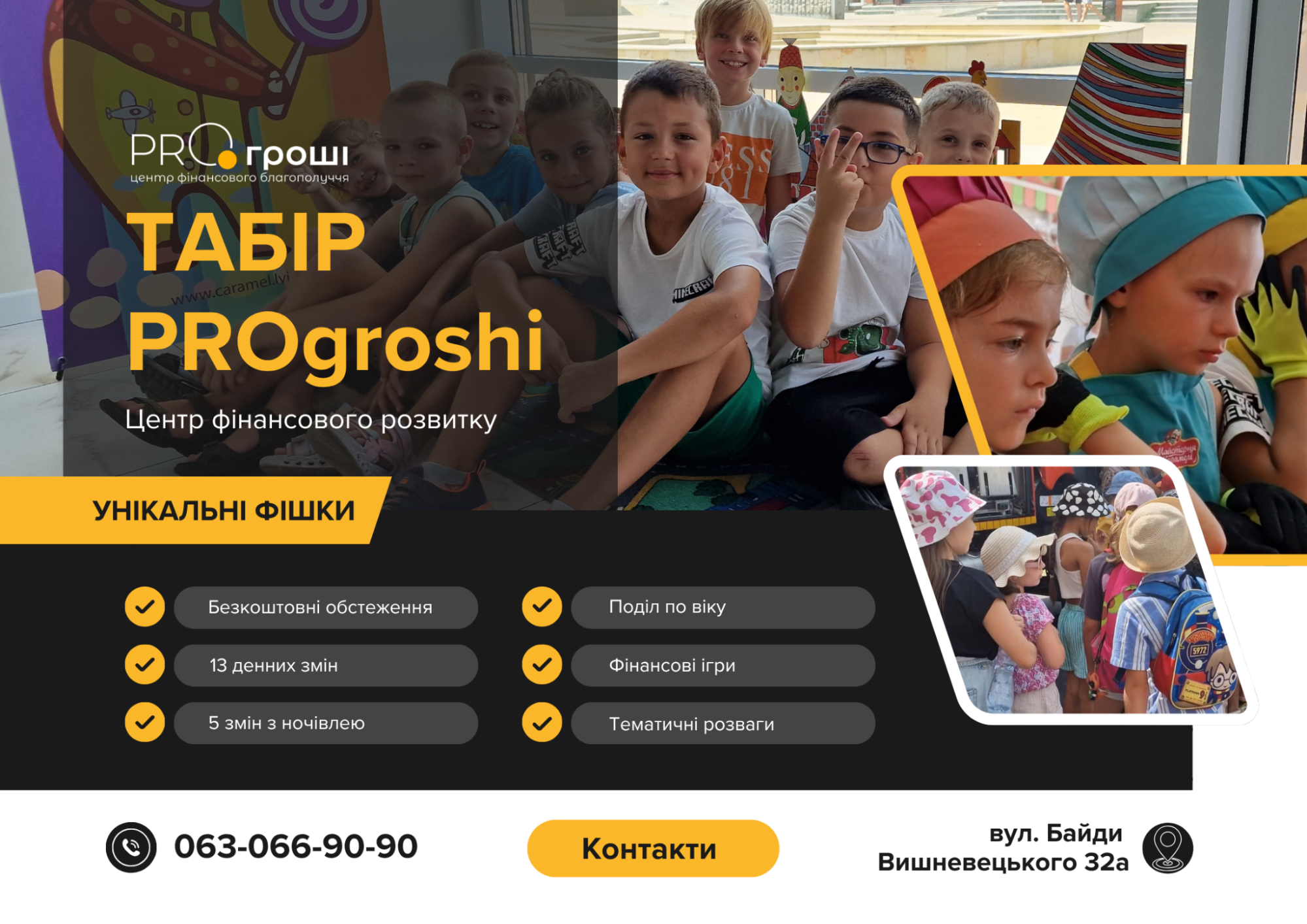 Цього року PROгроші заслужено посів першу позицію в рейтингу черкаських таборів завдяки своїм унікальним фішкам – простору без ґаджетів і тематичним вечіркам. Для малечі пропонують денний табір і з ночівлею, є можливість обстежитися в лікарів.