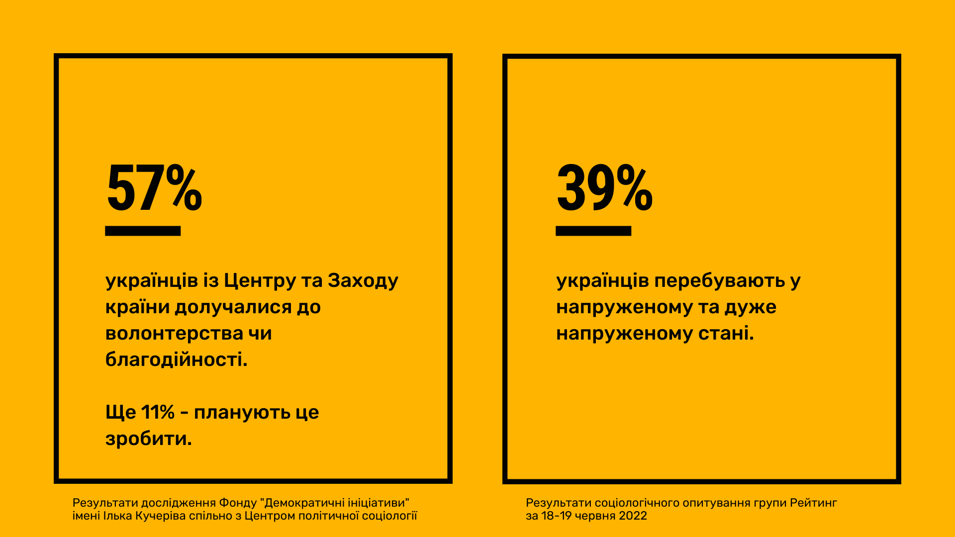 За даними дослідження Фонду «Демократичні ініціативи» імені Ілька Кучеріва спільно з Центром політичної соціології станом на травень 57% українців із центру та заходу України долучалися до волонтерства. Ще 11% – планували це зробити. Крім того, як свідчать дані опитування групи Рейтинг, станом на червень 39% українців перебували в напруженому та дуже напруженому стані