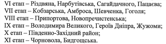 Нині роботи тривають у частині Південно‐Західного району та Центрі (вул. Благовісна, Б. Вишневецького, Гоголя, О. Дашковича, Надпільна, Святотроїцька, Слави, Хрещатик, Грушевського, Шевченка).