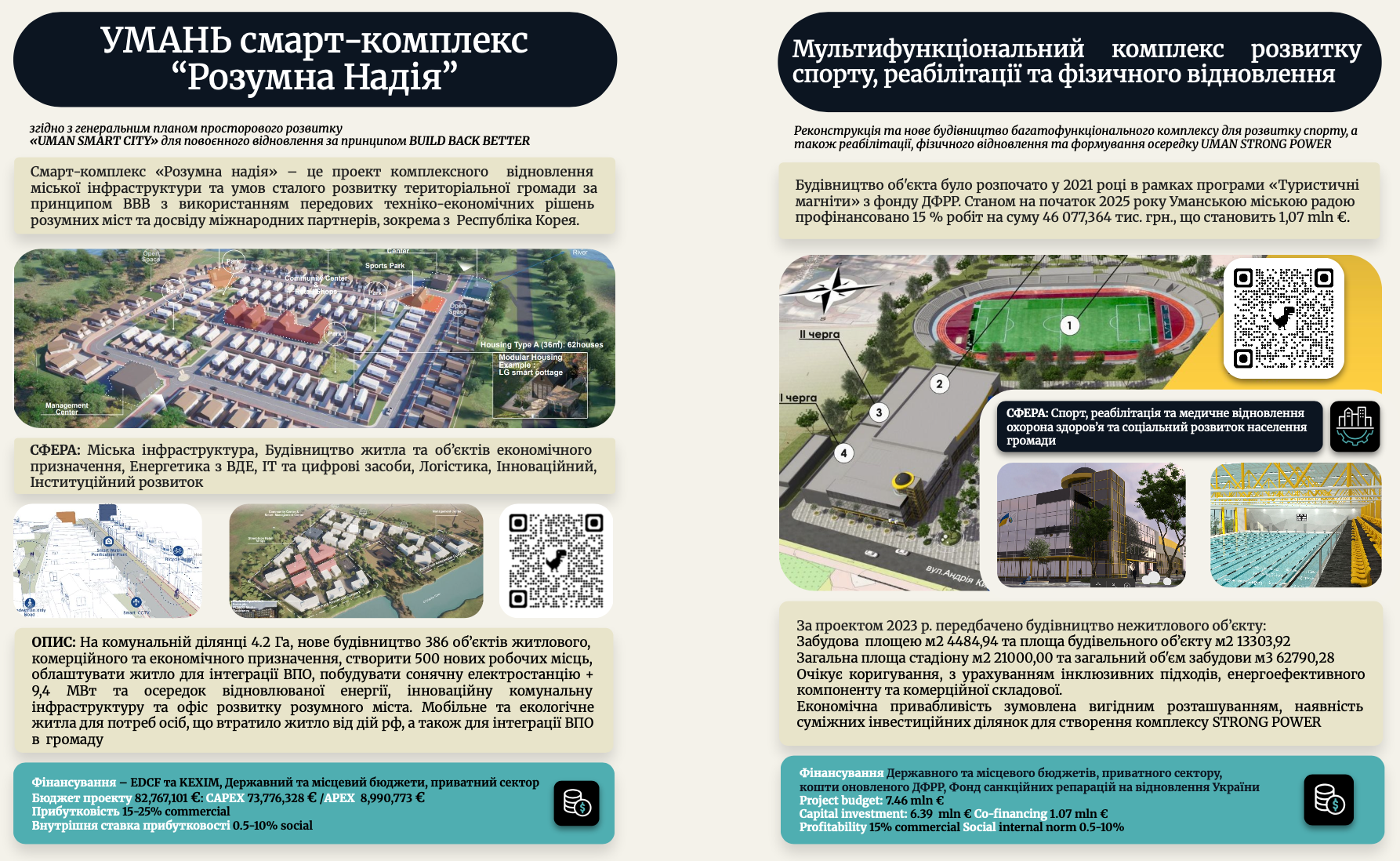 Другим проєктом, який презентуватимуть уманчани, є будівництво мультифункціонального комплексу розвитку спорту, реабілітації та фізичного відновлення. Фактично мова про добудову проєкту, реалізація якого почалася до повномасштабного вторгнення і на який вже витратили майже 50 млн гривень, втім це лише 15 % від необхідного будівництва. Загальну вартість робіт тут оцінили у майже 7,5 млн євро.