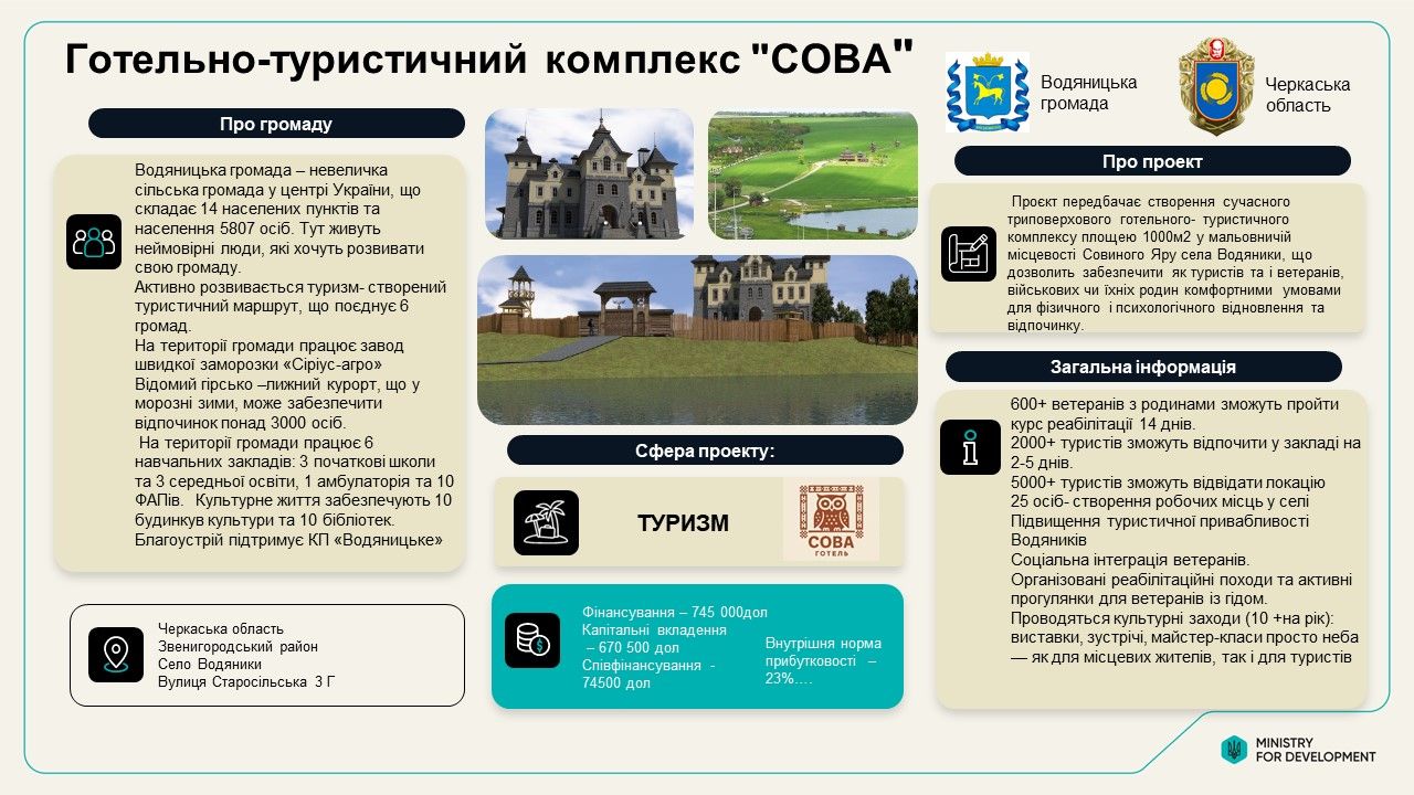 - У нас відібрали проєкт із будівництва готельно‐оздоровчого комплексу у межах меморандуму, підписаного між нами та сусідніми громадами із розбудови туризму, – говорить Каюк та додає, що окрім туристичної функції цей об’єкт має виконувати ще й оздоровчу та соціальну ролі.
