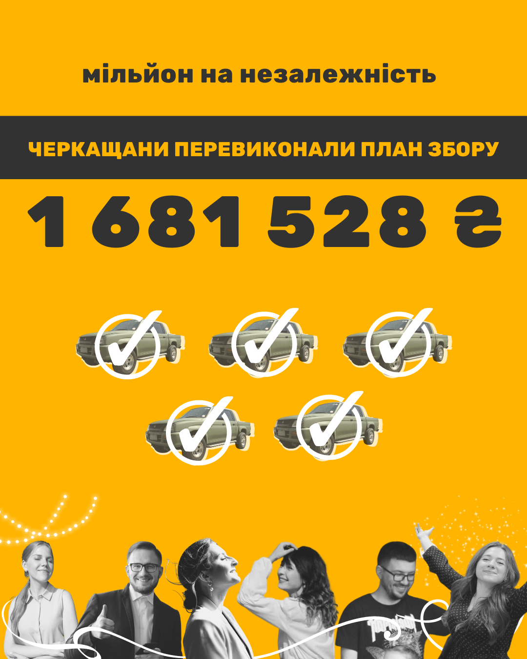 2. Нам разом з вами вдалося перевиконати завдання. Тому наші військові отримають не 3 пікапи, як планувалося, а цілих 5!