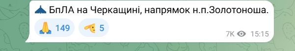 БпЛА на Черкащині рухається у напрямку Золотоноші.