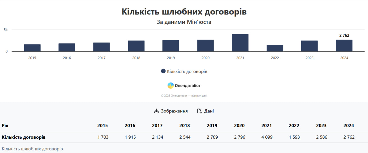 Додамо, у 2024 році в Україні зареєстрували 2 762 шлюбні договори, за інформацією з платформи «Опендатабот». Це на 7 % більше, ніж у 2023 році. Проте на третину менше, ніж у 2021 році.