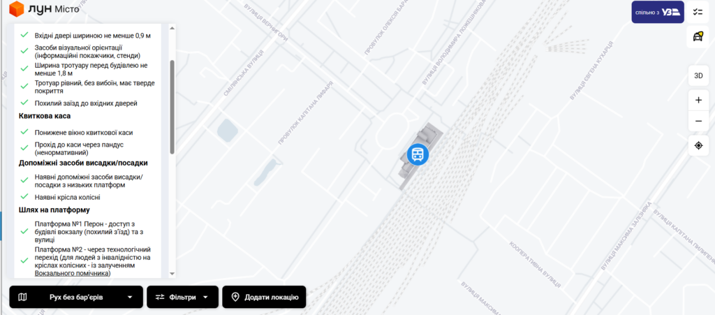 На мапі «Місто без меж» можна дізнатися інформацію про рівень доступності вхідних груп, квиткових кас, інформаційних стійок, залів очікування, укриттів. Також повідомляють про наявність ліфтів, допоміжних засобів висадки/посадки, кімнати батьків і дітей, зазначають, чи є персонал допомоги – вокзальні помічники. Крім цього, на 3D‐моделях можна роздивитися вхід та колії.