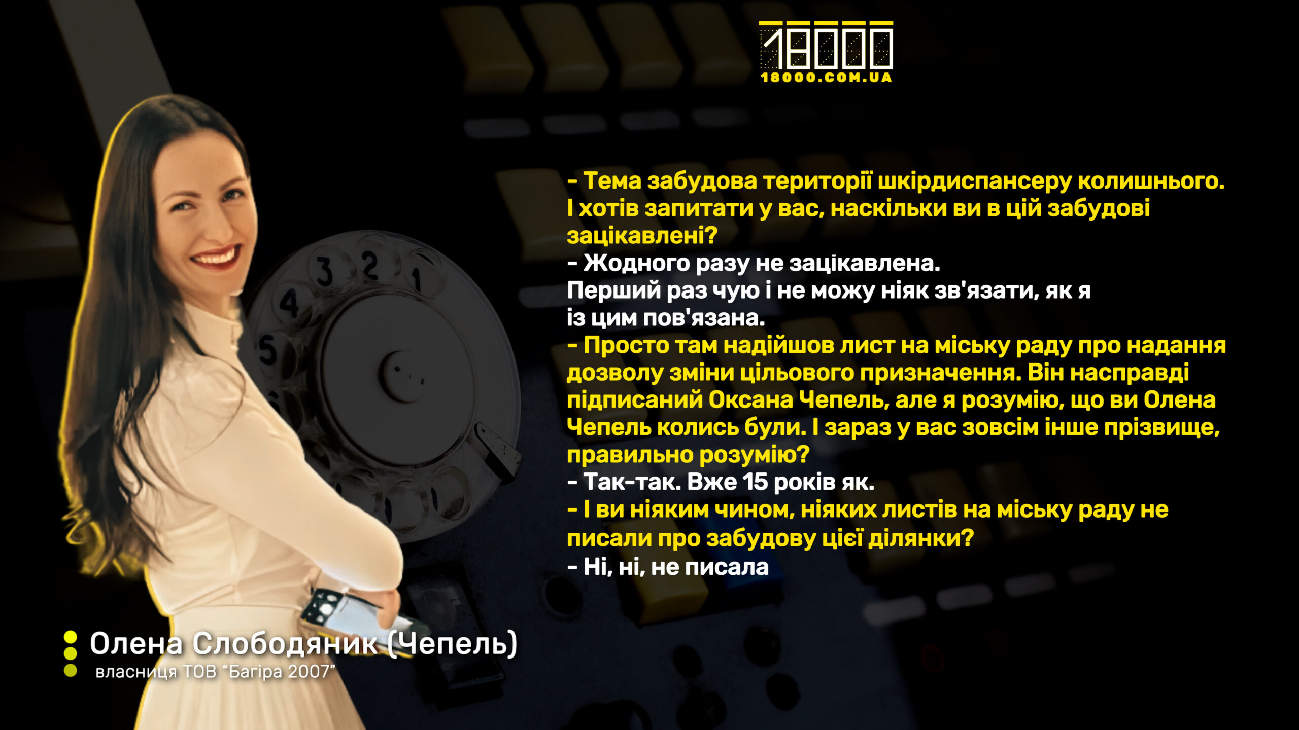 Як з’ясував «18000», особа з прізвищем та ім’ям Оксана Чепель не має стосунку до нерухомості у Черкасах і жодними компаніями тут не керує. Офіційно співвласницею компанії і директоркою, яка у 2010 році викупила корпус у місцевої ради, є Олена Слободяник. На той момент вона мала інше прізвище – Чепель.