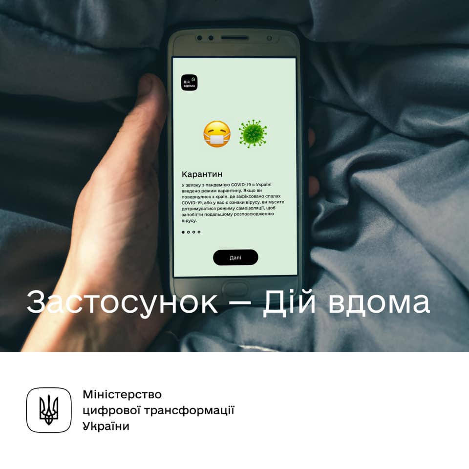 В Україні запрацював мобільний додаток для моніторингу самоізоляції. Мобільна програма «Дій Вдома» здійснюватиме моніторинг режиму обов’язкової самоізоляції, на якій мають перебувати громадяни, що прибули з‐за кордону, з підтвердженням або підозрою на зараження Covid‐19.