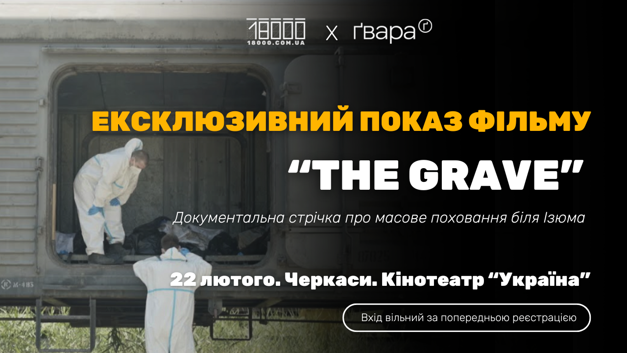 Фільм «The Grave» («Могила») ексклюзивно покажуть у Черкасах. Це документальна стрічка. Її створили харківські журналісти медіа «Ґвари» у співпраці з британською Studio 9 Films. Цей фільм – спроба не тільки зафіксувати злочини, а й зберегти докази для майбутнього покарання винних.