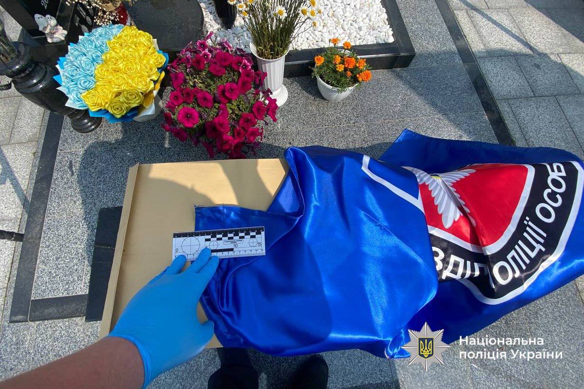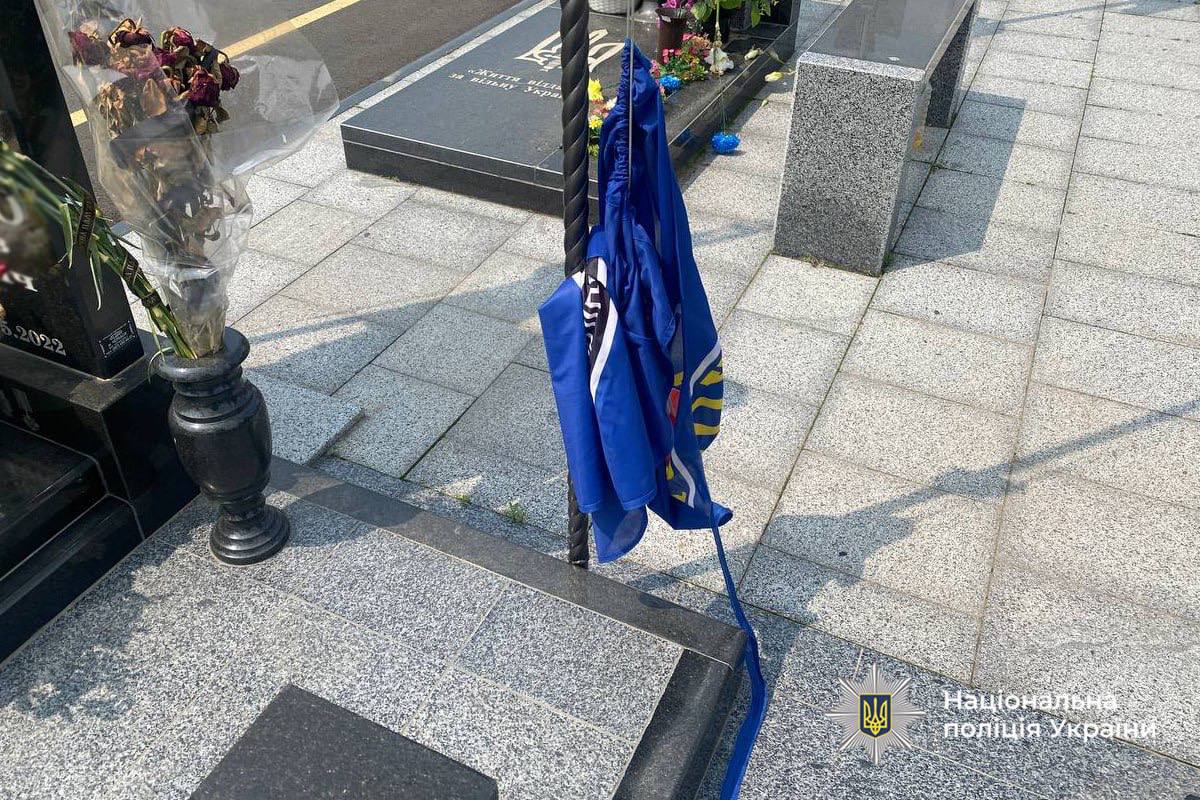 Повідомлення від черкащанки про осквернення могил на одному з місцевих кладовищ надійшло до поліції 1 червня. На місці поліцейські виявили пошкоджені прапори із символікою підрозділу поліції, встановлені на місцях поховання загиблих бійців.