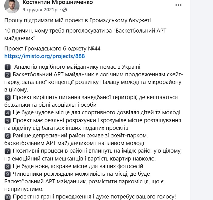Костянтин Мірошниченко просить підтримати свій проєкт