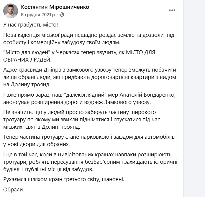 13 грудня відбувся мітинг проти забудови. Одним з його організаторів та ідейним натхненником виступив Костянтин Мірошниченко.