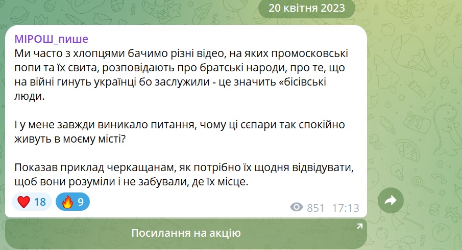 – Ми з хлопцями дивимося відео з лаври, де вони (представники МП – ред.) кажуть, шо на сході помирають «бісівські люди», називають себе «русічами». Так‐от, коли цього всього надивишся, то розумієш, що цю церкву треба щемити і дуже сильно. Кожен сепаратюга має некомфортно себе почувати в нашій країні, – сказав тоді Мірошниченко.