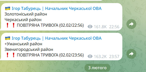 Додамо, близько півночі 2 лютого в Черкаській області була оголошена повітряна тривога. Про це повідомляв начальник Черкаської ОВА Ігор Табурець.