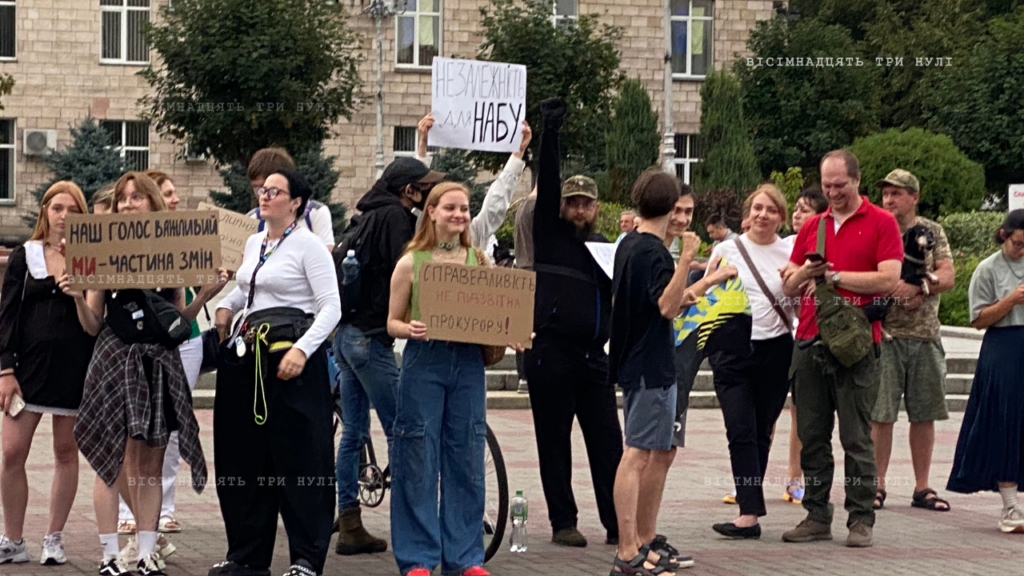 На Соборній площі зібралися до ста людей на акцію про важливість незалежності антикорупційних органів. Вони були з плакатами «Стоп 12414», «Справедливість непідзвітна прокурору», «Незалежність для НАБУ», «Наш голос важливий. Ми частина змін».