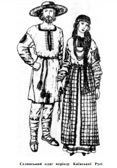 Та повернімося знову до Київської Русі, де через широку соціальну диференціацію населення одяг кожного стану вже мав свої особливості. Як і в пізніші періоди, чоловіки‐селяни носили одягнену на випуск сорочку, яку підперізували шкіряним або в’язаним поясом, а також неширокі штани. На голову одягали валяну шапку, а на ноги – плетені з кори або стебел рослин личниці чи стягнуті зі шкіри постоли. Жінки ж носили довгу вишиту сорочку та поясний одяг у вигляді одного або двох незшитих, а пізніше частково зшитих шматків орнаментованої або квітчастої тканини. На голові незаміжні дівчата мали вінець, який ще звався корун чи вінок, а заміжні – рушникоподібний убір, що міцно тримав волосся.