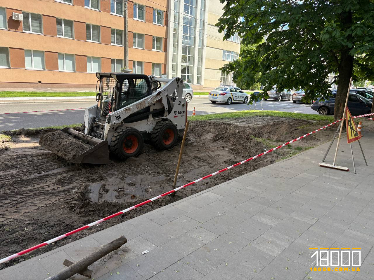 Поблизу перехрестя вже ведуть роботи з розширення тротуару. На місці працює відповідна техніка.