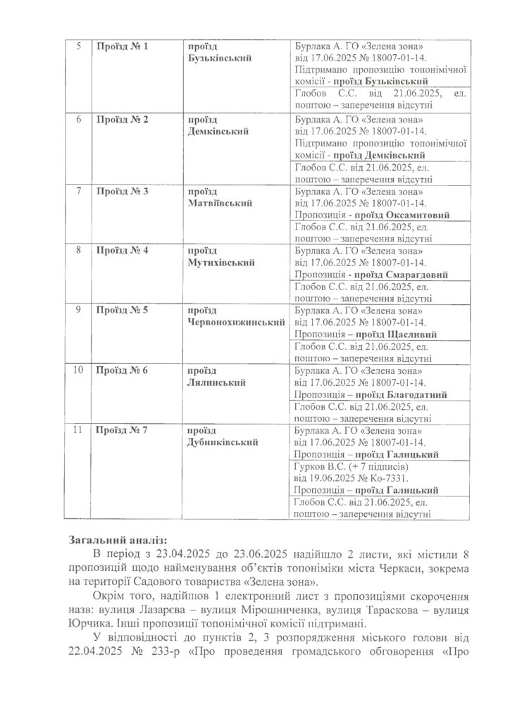 Громадські обговорення тривали з 23 квітня до 23 червня. За цей час до міської ради надійшли два листи. У них було вісім пропозицій щодо найменування проїздів на території садового товариства «Зелена зона». Серед запропонованих назв – проїзди Благодатний, Галицький, Смарагдовий, Оксамитовий, Щасливий та інші.