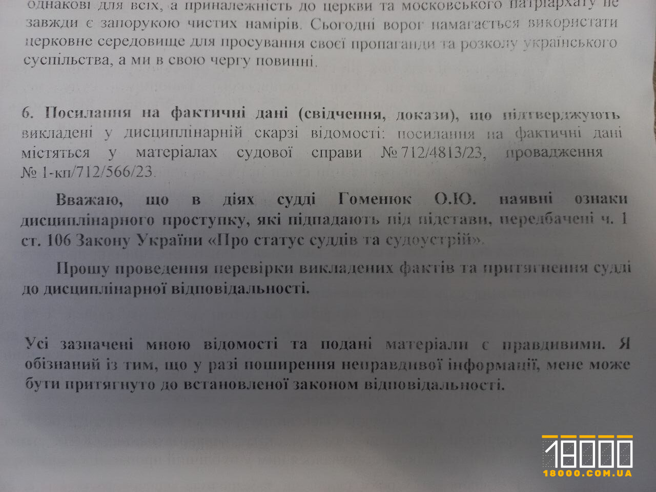 Небайдужі підписали скарги, у яких йдеться про те, що в діях судді Олександри Гоменюк є ознаки дисциплінарного проступку, які підпадають під підстави ст. 106 Закону України «Про статус суддів та судоустрій». У документі закликали перевірити ці факти і притягнути суддю до відповідальності.