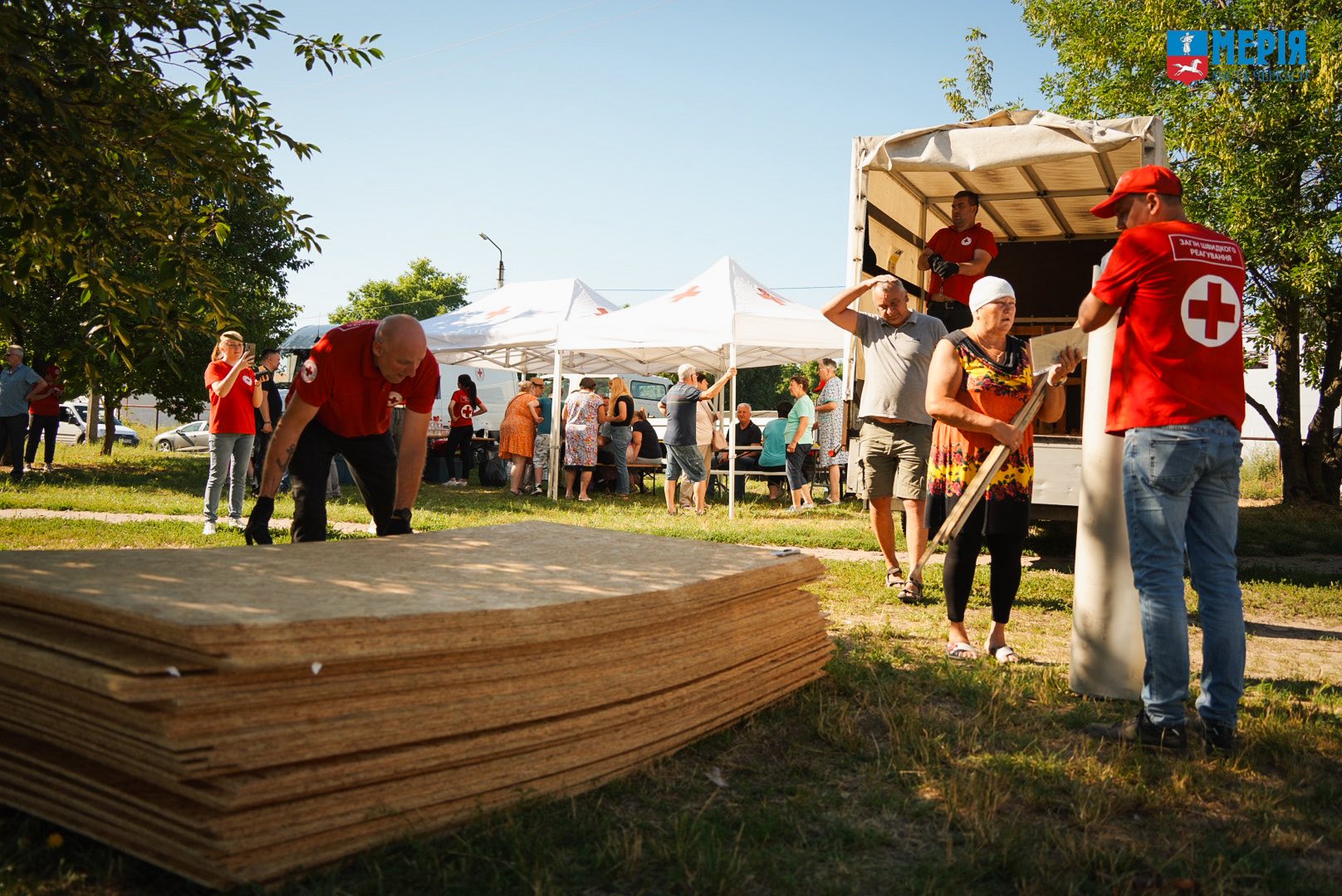 Червоний Хрест видає постраждалим будівельні матеріали для закриття вибитих вікон і пошкоджених дахів. Також людям надають психологічну допомогу.