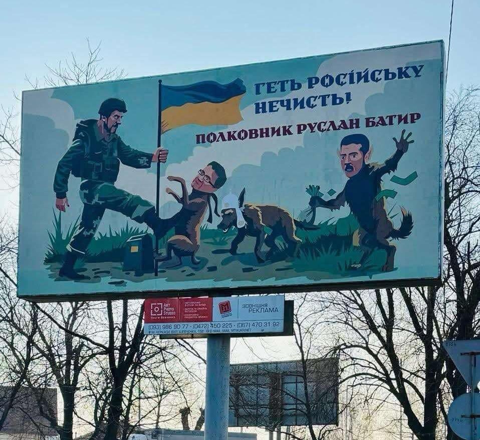 У мережі опублікували фото з провокативним білбордом, на якому зображені депутат Черкаської міської ради Руслан Батир, а також пародійні образи, які можуть бути схожі на нардепів Віталія Войцехівського та Антона Яценка.