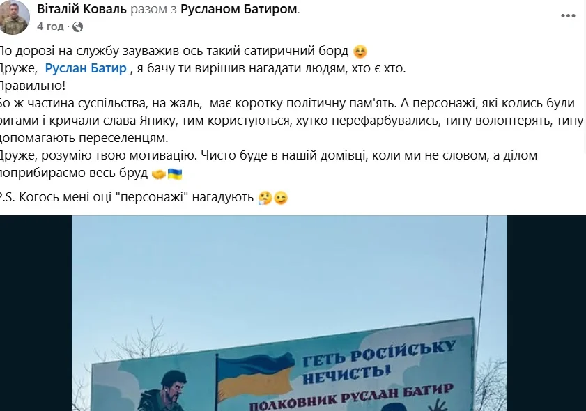 Зі свого боку депутат Черкаської обласної ради від партії «Європейська Солідарність» Віталій Коваль написав, що Батир «вирішив нагадати людям, хто є хто» таким білбордом.