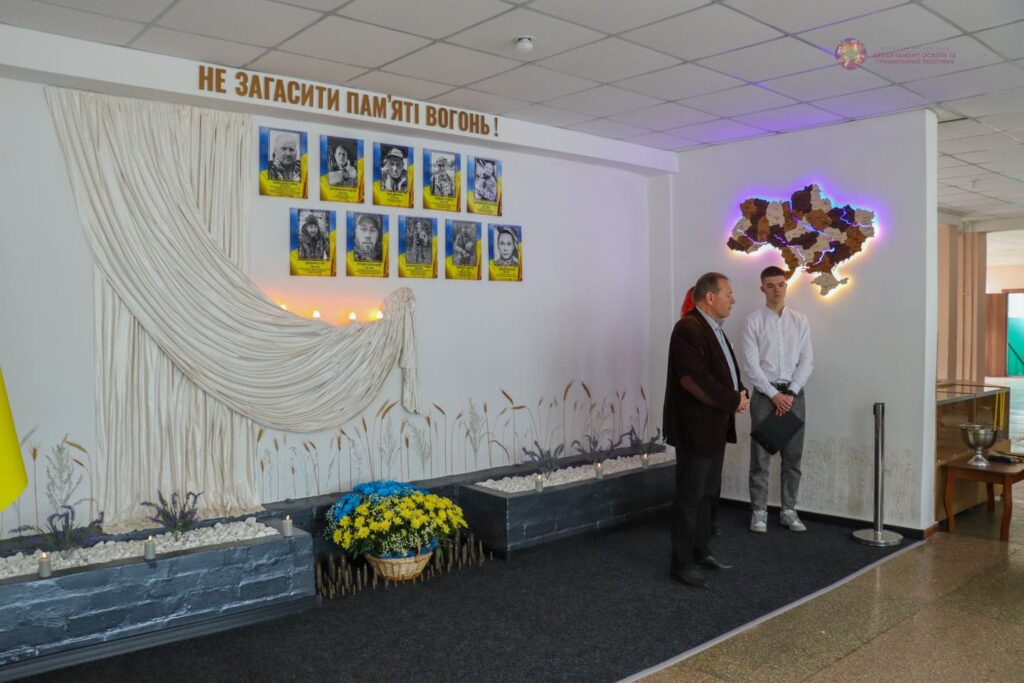На стіні пам’яті зображені портрети шести випускників, які загинули, захищаючи Україну. Під час відкриття меморіалу педагоги та учні разом із рідними захисників вшанували памʼять полеглих.