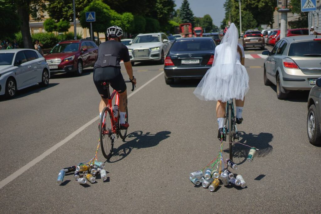 Черкасці Тетяна та Олексій Вовк весільну церемонію у РАЦСі відзначили у спортивній формі та на велосипедах 6 червня. Частина їхніх гостей приєдналися до святкування у такому ж дрес‐коді. Вони влаштували заїзд містом.