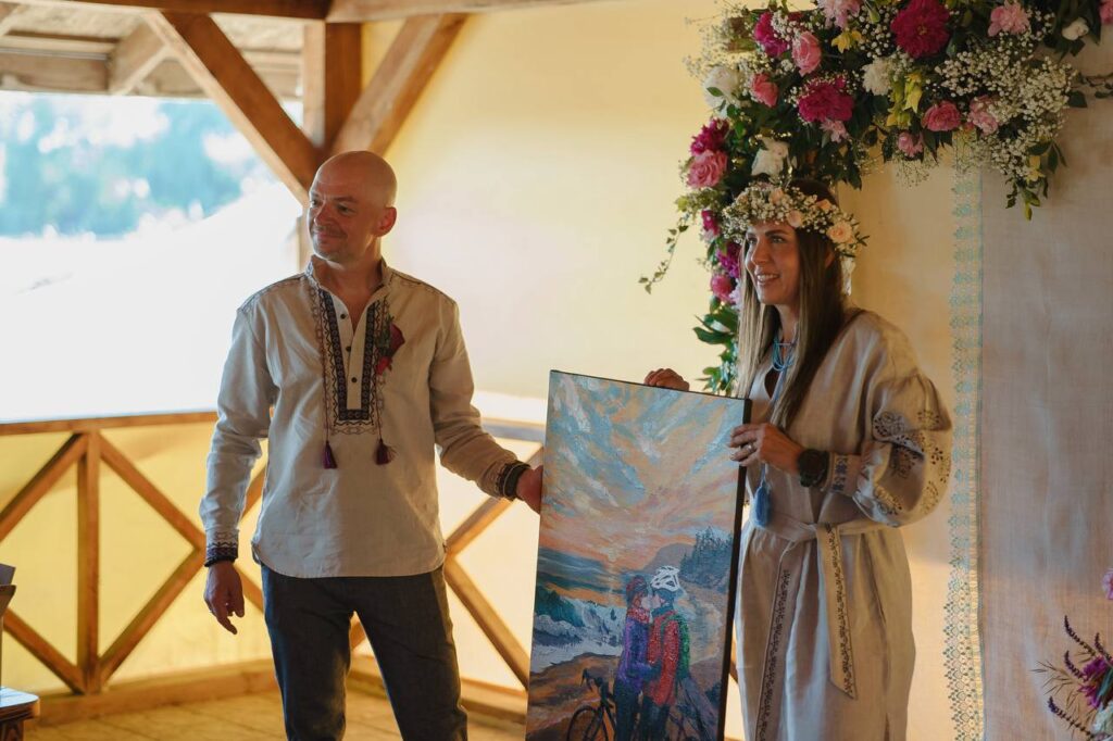 Олексій та Тетяна Вовк на весіллі тримають картину з велосипедистами
